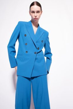 blazer de coupe droite en tissu de laine mélangée stretch. revers en pointe, poche poitrine, poches latérales à double passepoil et manches longues avec boutons aux extrémités. doublé. fermeture à double boutonnage avec boutons personnalisés avec le logo des tourtereaux. – le mannequin mesure 175 cm et porte une taille 40.