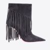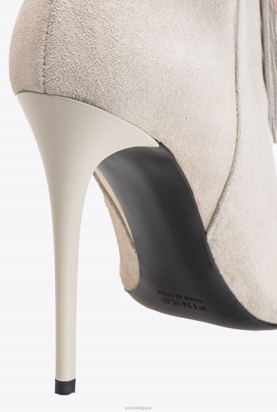 bottines en daim souple, avec un design tubulaire ajusté, des franges décoratives de style cowboy et un petit logo pinko en relief sur le dessus. bout effilé et semelle en cuir avec talon aiguille de 10 cm. semelle intérieure rembourrée et doublure en microfibre respirante.