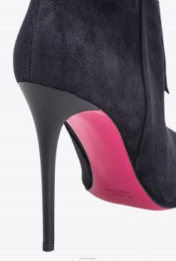 bottines en daim souple, avec un design tubulaire ajusté, des franges décoratives de style cowboy et un petit logo pinko en relief sur le dessus. bout effilé et semelle en cuir avec talon aiguille de 10 cm. semelle intérieure rembourrée et doublure en microfibre respirante.