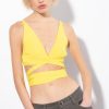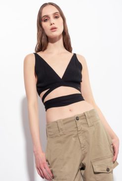 Haut brassière en crêpe de viscose stretch côtelé. décolleté en V plongeant sur le devant, décolleté droit dans le dos et plaque personnalisée avec le logo des tourtereaux. longs lacets à nouer en bas. – le mannequin mesure 175 cm et porte une taille 40.