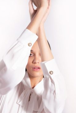 chemise coupe classique en popeline de coton à très fines rayures verticales. col pointu, manches longues montées légèrement basses, avec revers orné de lacets au bas. fermeture boutonnée sur le devant.