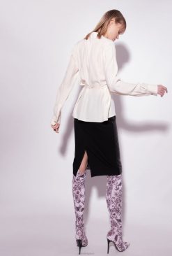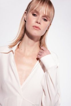 chemise féminine en crêpe de Chine de soie mélangée. col pointu avec col en V et manches longues avec poignet orné de boutons bijoux. fermé par un lien à la taille. cette pièce est fabriquée à partir de matériaux – certifiés tout au long de la chaîne de production – issus de forêts gérées selon les principes de durabilité.