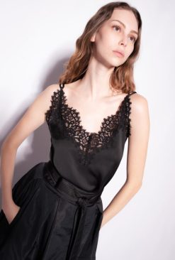 haut de lingerie sans manches en satin brillant avec col en V bordé de dentelle. fines bretelles avec lien qui s’attache au dos. cette pièce est fabriquée à partir d’un matériau durable contenant des fibres recyclées, dans le but de réduire les ressources utilisées et d’augmenter la qualité du produit. cette pièce est fabriquée à partir de matériaux traités sans substances susceptibles de nuire à l’environnement ou à la santé des consommateurs.