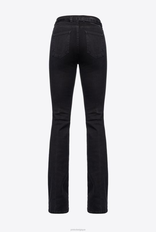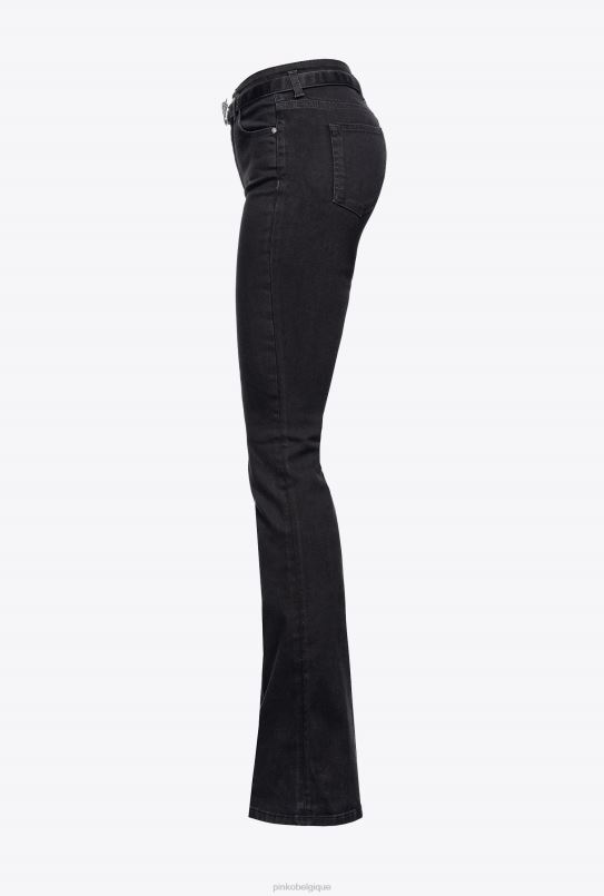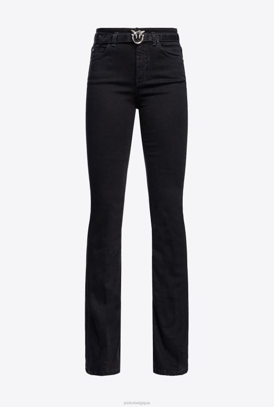 Jean évasé de style jegging à cinq poches en denim stretch noir. taille classique avec passants de ceinture, ceinture en tissu assorti avec boucle taille diamant mini love bird et jambe fine évasée vers l’ourlet. Fermeture par zip et bouton-pression en métal.