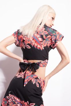 jupe drapée longueur mi-mollet style paréo en popeline de coton à imprimé tropical sur fond noir. détail torsadé à la taille qui crée une fente ouverte sur le devant. – le mannequin mesure 175 cm et porte une taille 40.