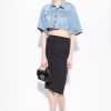 Jupe fourreau longueur mi-mollet en tissu technique viscose effet néoprène. Pièce ajustée, taille haute, surpiqûres verticales et fente milieu en bas du dos. Fermeture zippée centrale dissimulée au dos.