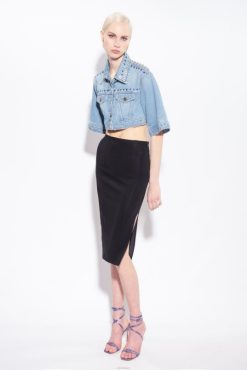 Jupe fourreau longueur mi-mollet en crêpe technique stretch. taille haute et fente au milieu en bas au dos. Fermeture zippée centrale dissimulée au dos. – le mannequin mesure 175 cm et porte une taille 40.