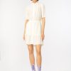 robe courte en crêpe marocain de viscose légère. petit col montant, manches courtes avec revers et taille élastiquée. jupe courte légèrement évasée avec volant dans le bas. fermeture boutonnée sur le devant.