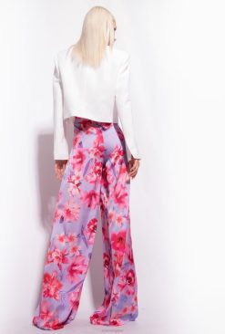 pantalon palazzo fluide en satin avec imprimé fleurs tropicales all-over. taille haute avec dos élastiqué. fermeture zippée invisible. – le mannequin mesure 175 cm et porte une taille 40.