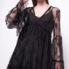 robe courte en dentelle à motif floral. col en V, manches longues cloche et taille empire avec volant sous la poitrine. jupe avec plis délicats, volant dans le bas et ourlet festonné. est livré avec un slip qui compense l’effet transparent de la dentelle.