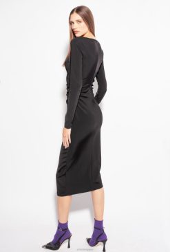 robe longueur mi-mollet en viscose technique fluide et stretch avec une texture distinctive d’aspect néoprène. coupe slim, encolure carrée avec bonnets moulés effet corset, manches longues et fente centrale à l’ourlet arrière. Fermeture zippée centrale dissimulée au dos.