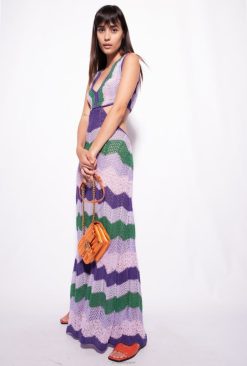 robe longue sans manches et ajustée en maille crochet avec détails en zigzag multicolores et lurex enfilé dans la matière. col rond, découpe au dos laissant les côtés ouverts et jupe fluide. – le mannequin mesure 178 cm et porte une taille 40.