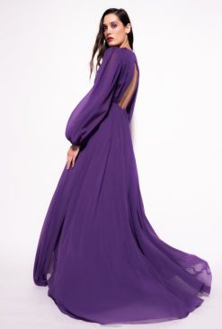 robe longue et élégante en mousseline légère. décolleté en V plongeant sur le devant, manches longues bouffantes avec revers et ouverture arrière laissant le dos ouvert. jupe longue et fluide fendue sur le côté sur le devant. doublé. Ouverture goutte d’eau fermée par un bouton au milieu à l’arrière. – le mannequin mesure 177 cm et porte une taille 40.