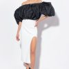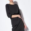 robe midi en tissu technique viscose aspect néoprène. Partie supérieure ample, avec col rond et manches trois quarts avec revers. Jupe fourreau ajustée et flatteuse. Fermeture zippée centrale dissimulée au dos.