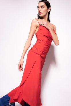 élégante robe midi sans manches en crêpe de Chine de soie mélangée. forme fluide et féminine, avec de fines bretelles, une large encolure dans le dos et un drapé devant et sur les côtés. jupe avec détail asymétrique et fente latérale sur le devant. doublé. Fermeture zippée centrale dissimulée au dos. cette pièce est fabriquée à partir de matériaux – certifiés tout au long de la chaîne de production – issus de forêts gérées selon les principes de durabilité. – le mannequin mesure 177 cm et porte une taille 40.