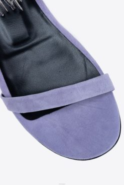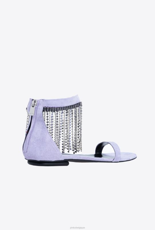 sandales plates en daim doux avec bride à la cheville ornée de franges en strass. bout rond et semelle en cuir avec talon plat de 2 cm. semelle intérieure en cuir rembourrée et doublure en microfibre respirante. fermeture zippée au talon.