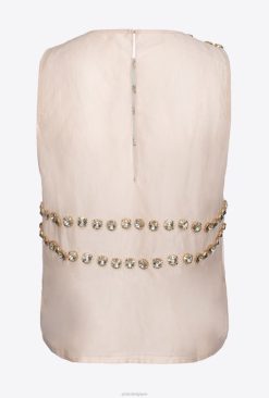 haut sans manches en mousseline légère, avec une broderie chaton brillante qui crée un effet collier multibrins. col rond et ouverture goutte d’eau fermée par un crochet au milieu dos.