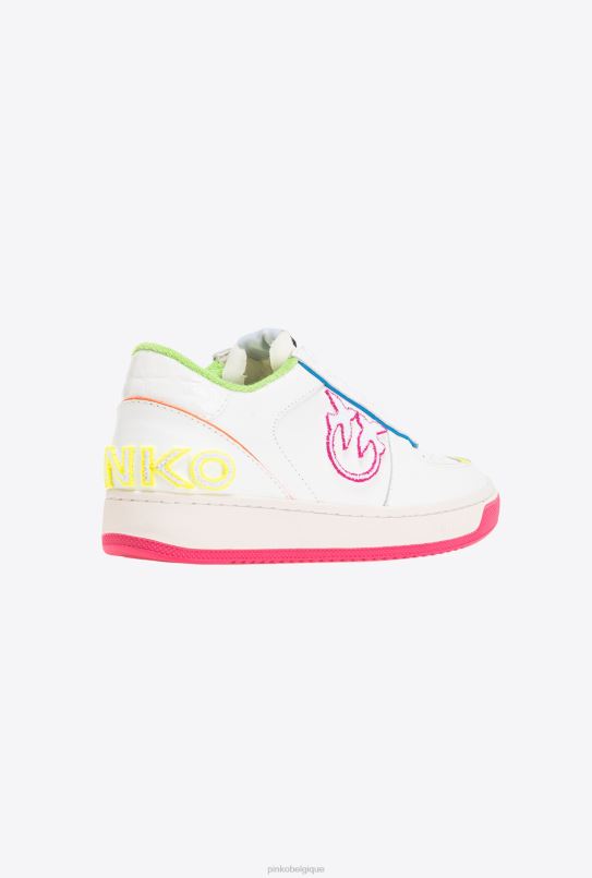 baskets plates en cuir, avec bordure fluo multicolore contrastée. logo love bird brodé à l’extérieur et logo pinko brodé sur le talon. Semelle caisson de 3 cm. semelle intérieure en cuir et doublure en tissu effet éponge.