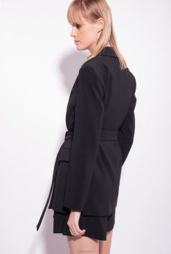 blazer féminin en crêpe technique stretch. col à revers, manches longues, petite poche passepoilée et poches à rabat sur les côtés. complet avec ceinture en tissu assorti attachée par des boutons au dos. doublé. fermeture à double boutonnage.