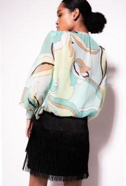 Blouse ample et fluide en voile léger, entièrement imprimée de fleurs colorées. Col en V croisé sur le devant, boutons recouverts et manches longues avec fronces sur les épaules et les poignets. – le mannequin mesure 175 cm et porte une taille 40.