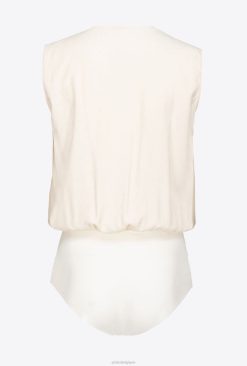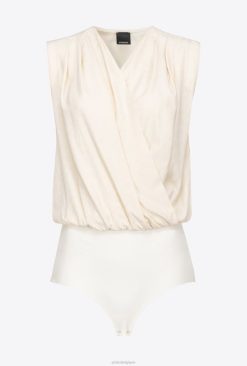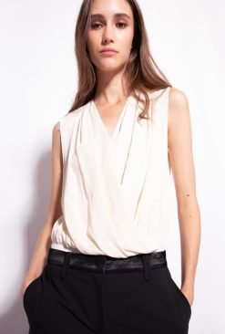 body fluide sans manches en crêpe de Chine avec détail logo en jacquard, col en V croisé sur le devant et drapé. – le mannequin mesure 177 cm et porte une taille 40.