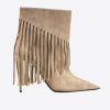 bottes tube hauteur genou en daim agrémentées de longues franges de style cowboy texan. bout fuselé et semelle en cuir avec talon aiguille laqué de 10 cm. semelle intérieure rembourrée et doublure en microfibre respirante.