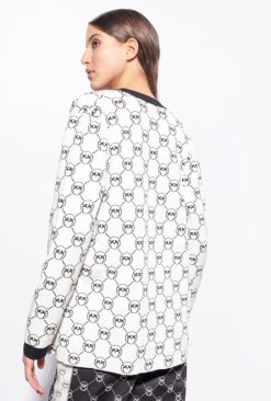 cardigan en fil tubulaire de viscose mélangée mélangée, en maille jacquard, avec un motif monogramme Love Birds all-over. l’écusson cœur appliqué sur le devant est personnalisé avec le lettrage pinko brodé de cristaux. encolure en V, manches longues et poches plaquées devant. fermeture invisible. – le mannequin mesure 175 cm et porte une taille 40.