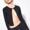 Cardigan court et ajusté en crêpe de viscose stretch côtelé. col rond fermé par un petit crochet en métal personnalisé avec le logo des tourtereaux. – le mannequin mesure 175 cm et porte une taille 40.