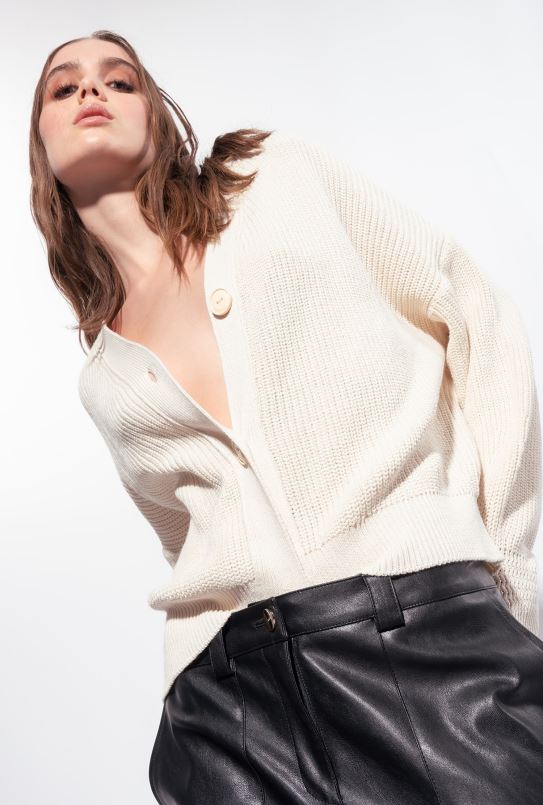 Cardigan légèrement oversize en coton mélangé côtelé. col en V et manches longues basses amples avec détails de poignets. fermeture boutonnée sur le devant. – le mannequin mesure 175 cm et porte une taille 40.
