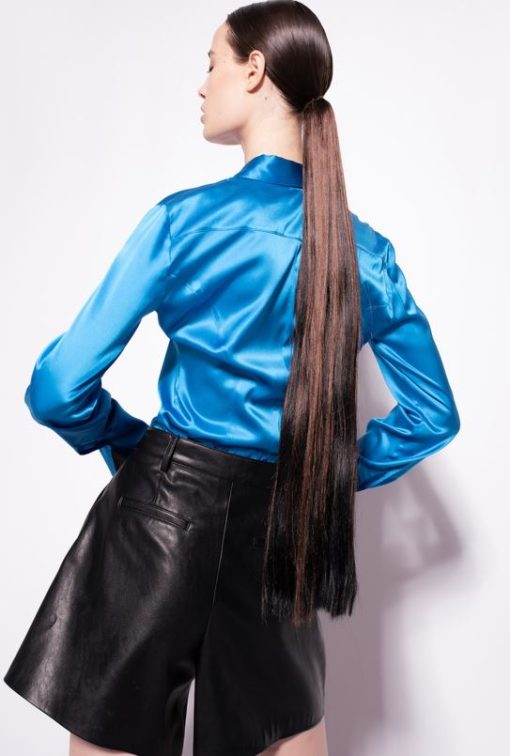 chemise ajustée en satin de soie extensible. col classique, manches longues avec revers et ourlet incurvé plus long devant que derrière. fermeture boutonnée sur le devant. – le mannequin mesure 177 cm et porte une taille 40.