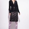 chemise féminine en crêpe de Chine de soie mélangée. col pointu avec col en V et manches longues avec poignet orné de boutons bijoux. fermé par un lien à la taille. cette pièce est fabriquée à partir de matériaux – certifiés tout au long de la chaîne de production – issus de forêts gérées selon les principes de durabilité.