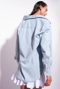 chemise en jean léger légèrement oversize, avec motif découpé au laser avec la lettre « p » et le logo des tourtereaux partout. col classique, manches longues montées basses et ourlet légèrement plus long dans le dos. fermeture par bouton-pression.