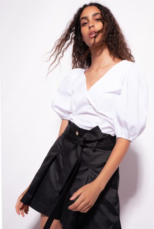 Blouse droite en popeline de coton stretch avec encolure en V et manches demi-bouffantes à bordure élastiquée. – le mannequin mesure 175 cm et porte une taille 40.