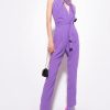 combinaison sans manches en tissu crêpe fluide. col rond avec plissage et découpe géométrique sur le devant. passants de ceinture et ceinture à nouer en tissu assorti à la taille. pantalon slim avec pinces et poches latérales en biais. Fermeture zippée centrale dissimulée au dos.