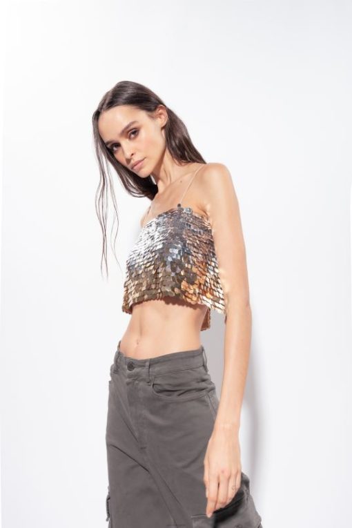 haut court court sans manches avec broderie de sequins effet délavé partout. pièce de coupe droite à fines bretelles, encolure droite, fermeture à un seul bouton milieu dos et ouverture effet fente.