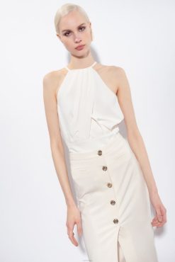 crop top sans manches en crêpe fluide. col rond avec pinces et bouton au dos, cache-coeur devant et longue découpe milieu dos. Fermeture zippée centrale en métal à l’arrière de l’ourlet. – le mannequin mesure 175 cm et porte une taille 40.