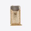 étui pour smartphone en cuir souple et soyeux, personnalisé avec une plaque Love Birds taillée en diamant sur une base en cuir. emplacements pour cartes à l’arrière. doublure en polycoton. fine bandoulière en chaîne ronde en métal.