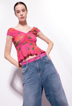 crop top ajusté en tissu mesh technique semi-transparent avec un imprimé floral coloré all-over. la construction à col en V avec mancherons peut être personnalisée, la transformant en un décolleté à épaules dénudées qui dénude les épaules. corsage froncé avec ourlet ébouriffé. doublé. – le mannequin mesure 177 cm et porte une taille 40.