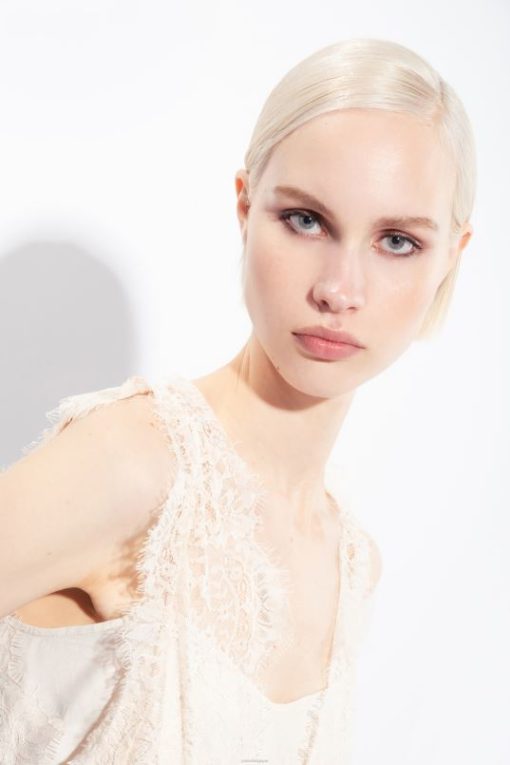 haut sans manches en crêpe de Chine de soie jacquard avec logo imprimé. détails en dentelle sur l’encolure carrée et l’emmanchure. cette pièce est fabriquée à partir de matériaux certifiés tout au long de la chaîne de production, issus de forêts gérées conformément aux principes de durabilité. – le mannequin mesure 175 cm et porte une taille 40.