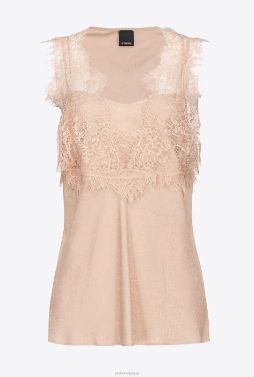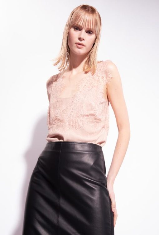 haut sans manches en crêpe de Chine de soie jacquard avec logo imprimé. détails en dentelle sur l’encolure carrée et l’emmanchure. cette pièce est fabriquée à partir de matériaux certifiés tout au long de la chaîne de production, issus de forêts gérées conformément aux principes de durabilité. – le mannequin mesure 175 cm et porte une taille 40.