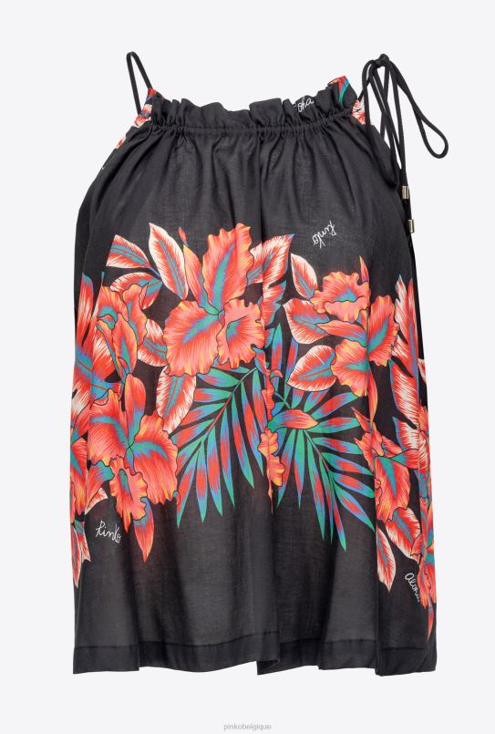 haut sans manches en mousseline de coton à imprimé tropical sur fond noir. forme ample et décontractée avec un col rond élastiqué et de fines bretelles dont une à nouer.