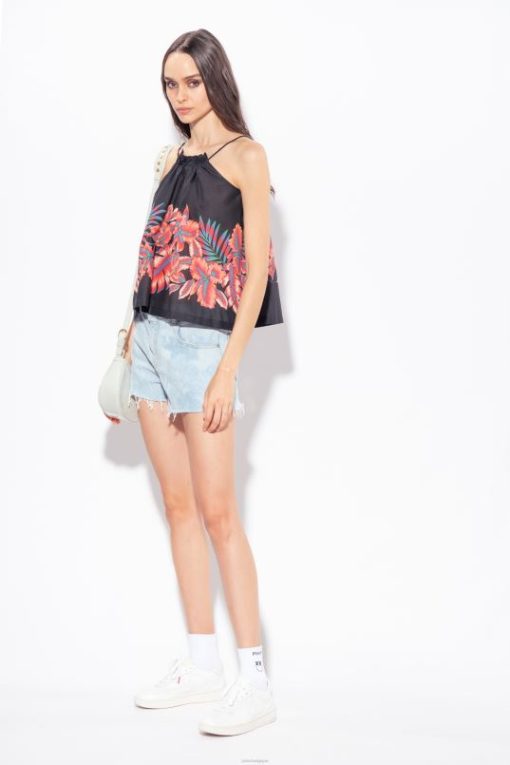 haut sans manches en mousseline de coton à imprimé tropical sur fond noir. forme ample et décontractée avec un col rond élastiqué et de fines bretelles dont une à nouer.