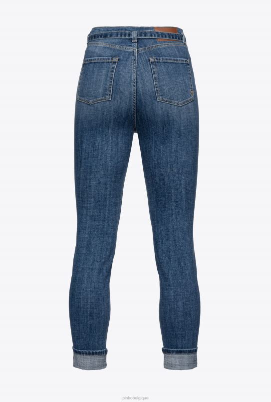 Jean skinny cinq poches en denim stretch bleu. taille haute avec passants de ceinture et fine ceinture en tissu assorti avec boucle mini tourtereaux en métal taille diamant. jambes ajustées pouvant être resserrées en bas. Fermeture par zip et bouton-pression en métal. – le mannequin mesure 175 cm et porte une taille 40.