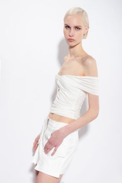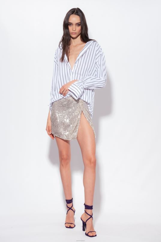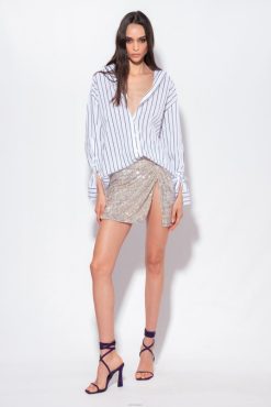 mini-jupe paréo drapée avec broderie de sequins partout et motif à rayures verticales. Taille froncée sur le côté, ce qui crée du mouvement sur le devant.