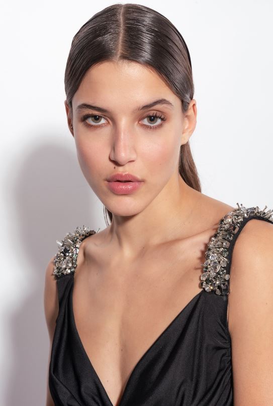 robe courte sans manches en tissu interlock brillant avec bretelles brodées de bijoux et de cristaux de différentes tailles. pièce ajustée avec petits drapés partout, col en V devant et dos nu. – le mannequin mesure 178 cm et porte une taille 40.