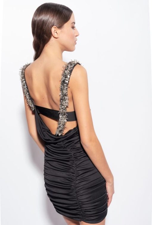 robe courte sans manches en tissu interlock brillant avec bretelles brodées de bijoux et de cristaux de différentes tailles. pièce ajustée avec petits drapés partout, col en V devant et dos nu. – le mannequin mesure 178 cm et porte une taille 40.