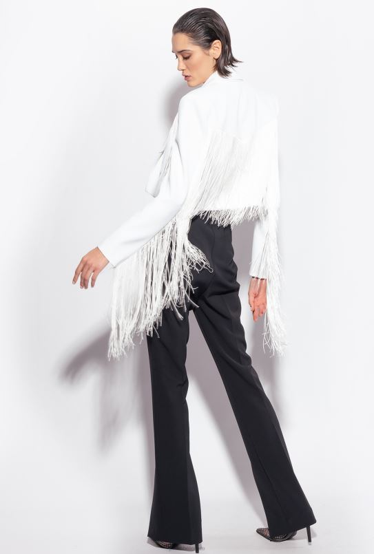 Pantalon slim en crêpe stretch avec taille haute et fente au milieu des bas de jambe. Fermeture zippée centrale dissimulée au dos. – le mannequin mesure 177 cm et porte une taille 40.