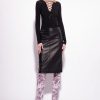 Pull coupe décontractée en maille de viscose et cachemire avec détail côtelé. col rond, manches longues chauve-souris et dos à col en V, avec détails à lacets et bordure frangée assortie. – le mannequin mesure 178 cm et porte une taille 40.