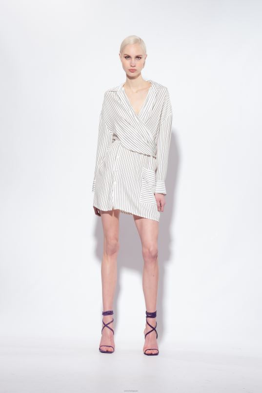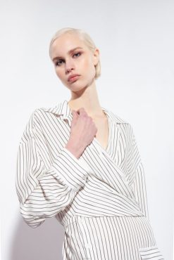 mini-robe-chemise en viscose avec motif à rayures verticales de couleur contrastée. col chemise croisé sur le devant, qui crée un effet de ceinture dans le dos, rassemblant le volume et accentuant la silhouette. Manches longues montées basses avec revers et poche plaquée sur le côté sur le devant. fermeture boutonnée asymétrique sur le devant.