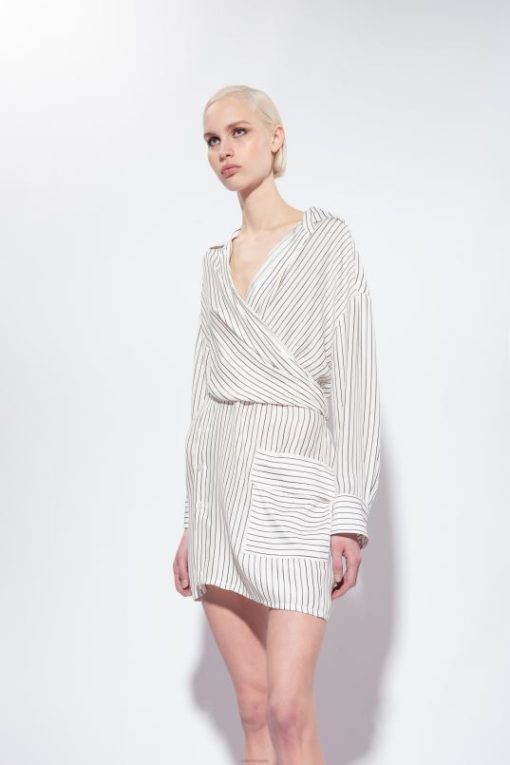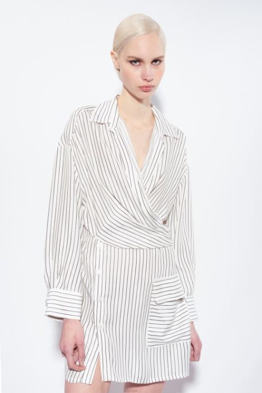 mini-robe-chemise en viscose avec motif à rayures verticales de couleur contrastée. col chemise croisé sur le devant, qui crée un effet de ceinture dans le dos, rassemblant le volume et accentuant la silhouette. Manches longues montées basses avec revers et poche plaquée sur le côté sur le devant. fermeture boutonnée asymétrique sur le devant.
